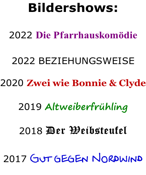 Zurück Bildershows:  2022 Die Pfarrhauskomödie  2022 BEZIEHUNGSWEISE   2020 Zwei wie Bonnie & Clyde  2019 Altweiberfrühling  2018 Der Weibsteufel  2017 Gut gegen Nordwind Gut gegen Nordwind Zwei wie Bonnie und Clyde Der Weibsteufel Altweiberfrühling